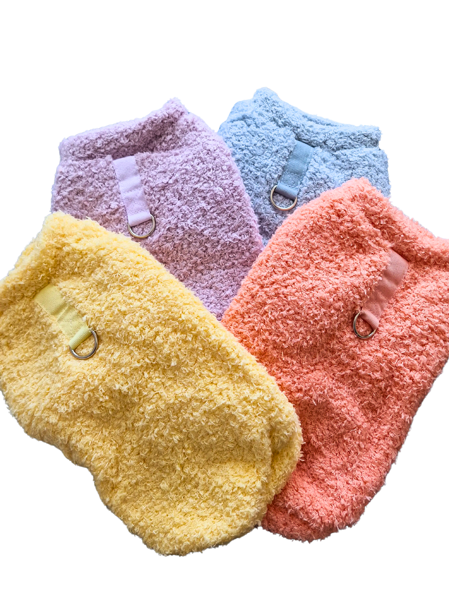 Warm, weich und unwiderstehlich: Die Hündli-Kuschelsweater in Pastell (Gelb, Flieder, Blau, Koralle) halten deinen Liebling gemütlich warm – ultraleicht und mit praktischem D-Ring für die Leine.