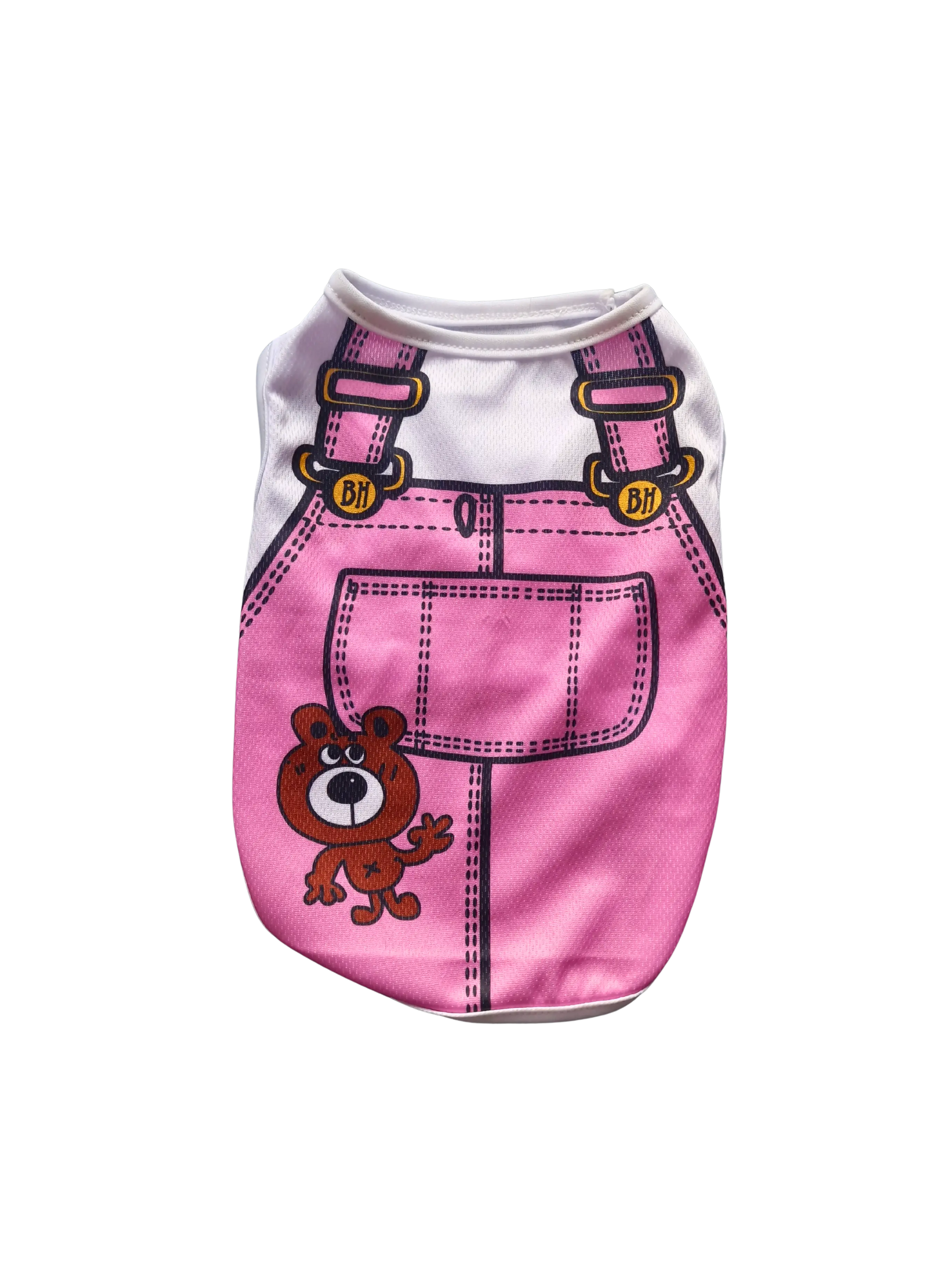 Süßes Hundeshirt mit Aufdruck von rosa Latzhosen und einem fröhlichen Bären. Leicht und atmungsaktiv, sorgt es für hohen Tragekomfort und einen originellen, lustigen Look. Perfekt für Spaziergänge, Treffen und Fotoshootings.